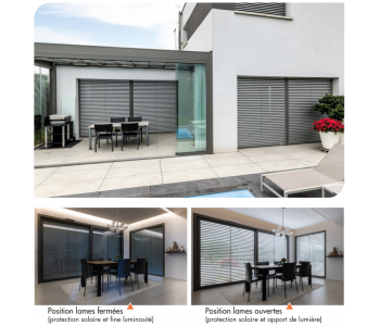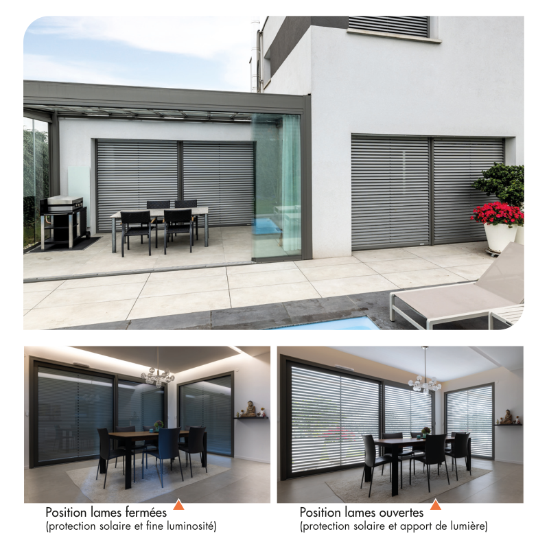 - Effet brise-soleil : une lame sur deux s’oriente à 85° pour faire entrer la lumière naturelle dans le logement tout en bloquant la chaleur